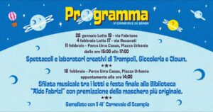 18 Febbraio appuntamento alle ore 14 al Parco Urra Casas di Piazza Urbania , concerto del gruppo Musicale ” Musica in cammino”, mostra dei manufatti della scuola Bel Forte del Chienti e Ghandi, Alle ore 15 inizio della sfilata musicata dalla Malamurga, Fanfaroma e Criansa tra le vie del quartiere e tra i lotti 49, 50, 52 per terminare in gran festa alla biblioteca Aldo Fabrizi con premiazione della maschera più originale.
