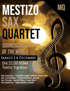 Mestizo è, in origine, una parola dallo spagnolo, che si traduce in una persona di ascendenza culturale mista, che descrive perfettamente la diversità globale di questo quartetto con membri da Israele, Costa Rica e Stati Uniti. Di conseguenza, siamo più appassionati di integrare la musica di ognuna delle nostre tradizioni musicali etniche e di suonare brani di compositori provenienti dai nostri paesi d’origine. Ci piace anche esporre i membri del pubblico al virtuosismo e diversi suoni del quartetto di sassofoni classico/contemporaneo.