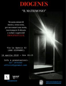 DIOGENES – Concerto Reading di Vania · 04/04/2018 Date: 14/04/2018Time: 18.15Location: Spazio Studio Ygramul - via La Spezia 63Sabato 14 Aprile – ore 18.15 allo Spazio Studio Ygramul in via La Spezia 63 Share