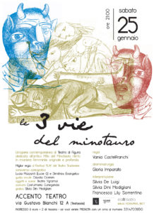Le attrici della Scuola di EsoTeatro Ygramul presentano il loro lavoro di diploma, un’opera contemporanea di Teatro di Figura dedicata all’antico Mito del Minotauro, riletto in maniera femminile, originale e profonda dalla scrittrice Gloria Imparato. “Le Tre Vie del Minotauro” – il Mito del Minotauro narrato dalle 3 Parche alla ricerca d’una via di fuga dal Destino e dai nostri Labirinti personali.