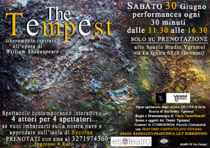 Gli allievi della Scuola di EsoTeatro Ygramul portano in scena la terza e più impegnativa applicazione degli studi di questo denso e lungo anno di studi teatrali… “The TEMPEST” – liberamente ispirato all’opera di William Shakespeare! 20 minuti di Performance di teatro contemporaneo, interattiva e di totale immersione per un pubblico di soli 4 spettatori, ove Prospero (il Mago dell’isola), Ariel (lo spirito dell’Aria al suo servigio), Miro (suo figlio sperduto) e Ferinanda (la Regina traditrice) vi guideranno dentro la Nave e sull’Isola della Strega Sycorax (rappresentata dal suono di Calibano e dalle immagini con i quadri di Ivo Cotani).